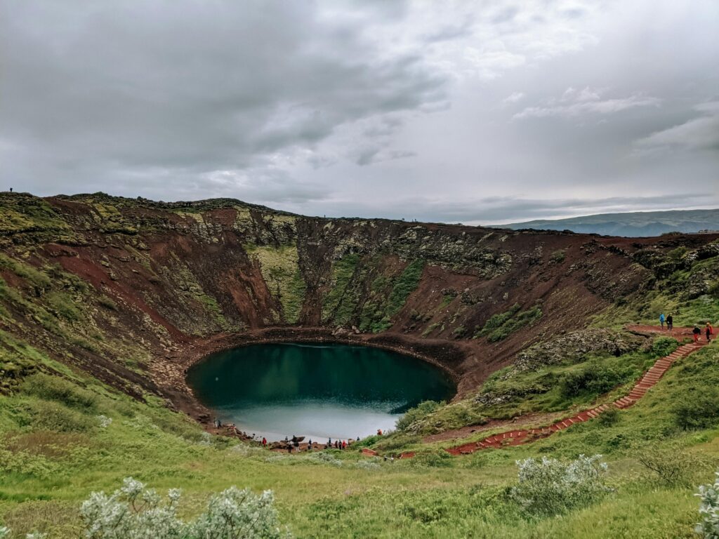 Kerið looks almost unreal at first glance: deep red volcanic rock wrapped around a still, blue lake. As you walk the rim or follow the path down towards the water, the colours shift with the light – rusty reds, oranges, dark greens and turquoise. On calm days, the surface mirrors the sky, creating photos that look like paintings.