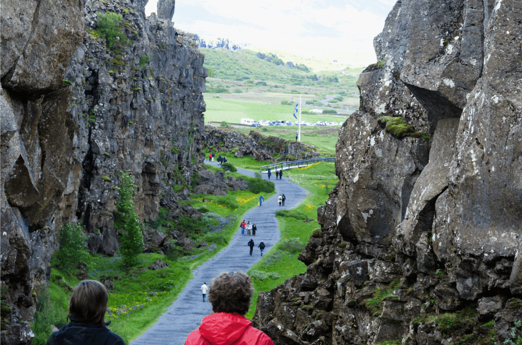 At Þingvellir, you don’t just “visit a UNESCO site” – you literally walk between continents. As you step onto the path, the air feels crisp and clear, and dark lava walls rise on both sides. Your guide shows you where the North American plate pulls away from Eurasia and invites you to pause with one foot on each side. This is where Iceland’s first parliament met under the open sky more than a thousand years ago. You hear the distant sound of Öxarárfoss, see the small church in the distance, and realise this valley holds both raw geology and quiet human history in the same breath.